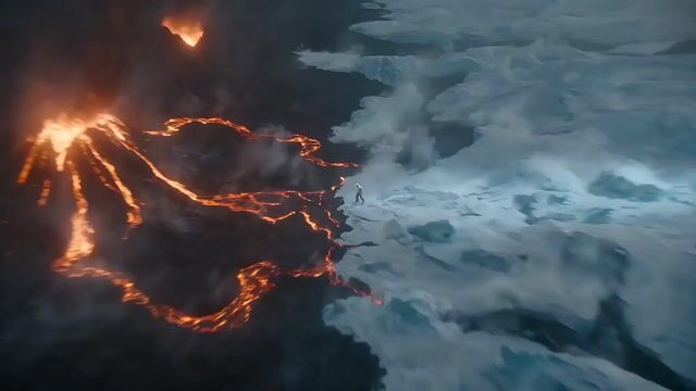 【Style】Epic Disaster Action, Live-Action VFX, Extreme Environments of Ice and Fire, Gritty Battle-Worn Visual Quality, High-Speed Photography, Realistic Physical Destruction. 【Duration】15 seconds 【Scene】The center of an island with permanently altered climate. On the left, an erupting volcano and flowing lava rivers; on the right, millennia-old glaciers and howling blizzards. In the middle, a steam-filled death zone. 【Characters (Humanized Description)】 Magma Admiral: Wearing a burnt dark-red suit, baseball cap, with a stern and resolute face, half of his body elementally transformed into scorching lava. Ice General: Wearing a frost-covered white vest, tall and languid, with breath that freezes into ice crystals. [00:00-00:05] Shot 1: Elemental Awakening and Environmental Reshaping. Wide-angle/Surrounding Shot. Two facing off. 【Magma Side】The ground beneath the Magma Admiral instantly melts into a boiling red lava pool, emitting billowing black smoke, and with a raised hand, a small volcano erupts behind him. 【Ice Side】The Ice General with one hand in his pocket, instantly spreads an ultra-fast freezing ice layer, turning the surging lava into black obsidian, with sharp ice shards instantly filling the air. [00:05-00:10] Shot 2: Ice and Fire Close Quarters Combat. Rapid Action Cuts. Intense close-range physical combat. 【Action Design】The Ice General instantly materializes a massive Ice Saber, striking at high speed. The Magma Admiral blocks with an elementally transformed Magma Fist. 【Physical Feedback】The ice blade strikes the lava fist, instantly vaporizing into high-pressure steam, accompanied by shattering ice fragments and sizzling lava droplets. Each collision triggers a small-scale steam explosion. [00:10-00:15] Shot 3: Fateful Ultimate Move Collision. Extreme Long Shot/Devastating Destruction. Both pull apart and simultaneously release ultimate moves. 【Visual Spectacle】A massive, roaring Magma Hellhound (Lava Giant Dog Form) charges towards the opponent; facing it, a gigantic Ice Bird (Blizzard Form) composed of countless ice blocks collides head-on. 【Ending】The two collide at the center of the frame, with extreme red-hot temperature and absolute zero blue-white color clashing. Instantly creating a super steam mushroom cloud connecting heaven and earth, with a massive shockwave simultaneously shattering the glaciers and volcano. The scene ends in white steam and energy flashes.