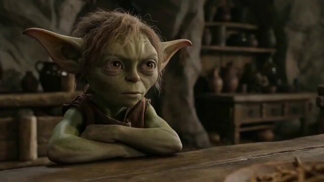 A multi-shot cinematic kitchen comedy about a family of mythical creatures. Integrated sound. Photorealistic, raw, cavernous tone, expressive micro-acting. No on-screen text. Photorealistic shooting. 180° shutter, 24 fps. Shot 1: Close-up of the little goblin girl at